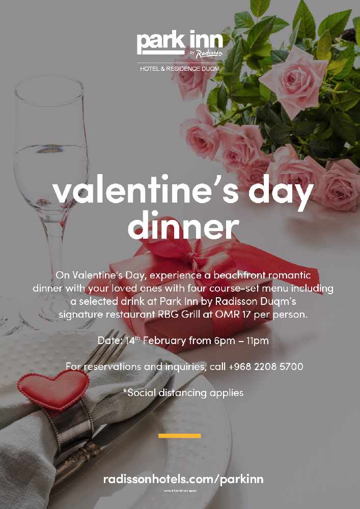 On Valentine’s Day, experience a beachfront romantic dinner with your loved ones with four course-set menu including a selected drink at Park Inn by Radisson Duqm’s signature restaurant RBG Grill at OMR 17 per person.
