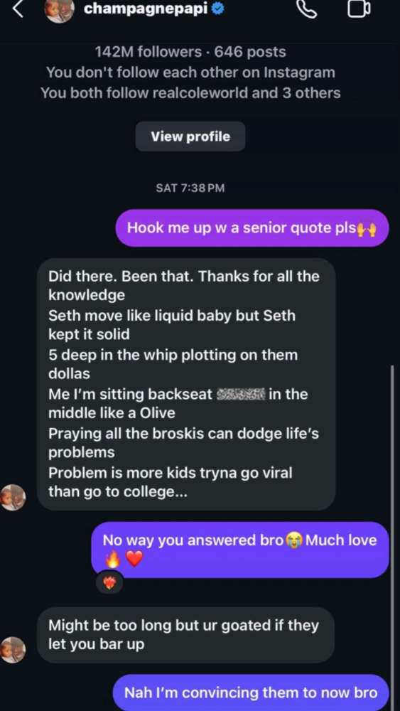 Drake got a DM from a fan asking for a senior quote for his yearbook, so Drake sent him a whole verse.