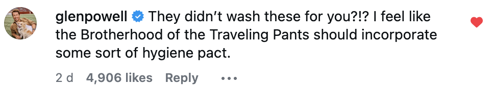 Fans and Glen Powell were quick to point out how unhygienic it was for the company to loan him unclean clothes.