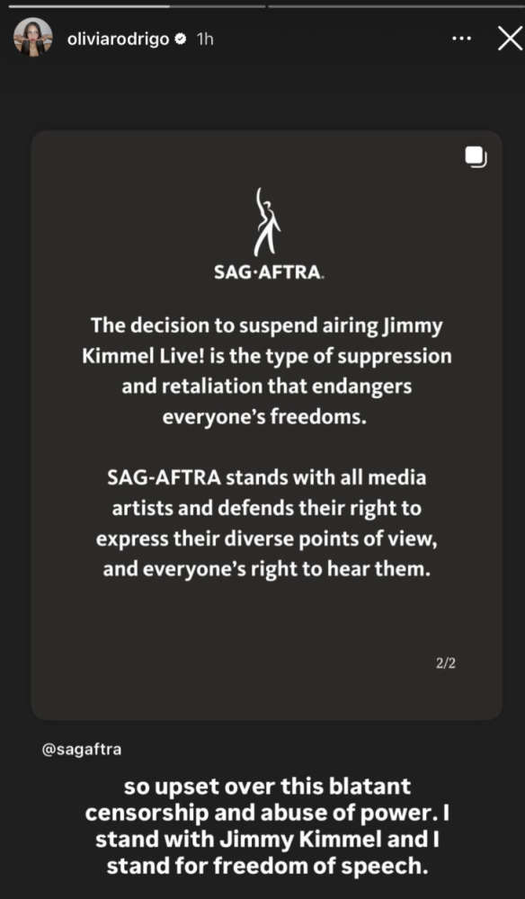 Olivia Rodrigo has spoken out against the suspension of Jimmy Kimmel’s show.